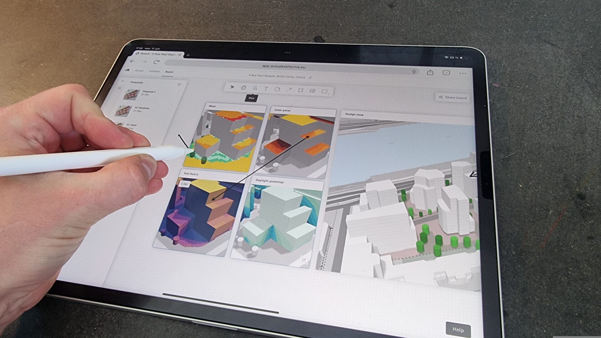 Autodesk Docs is also being used to feed data into Forma Board, a digital whiteboard and collaboration tool that allows project stakeholders to present and discuss concepts.