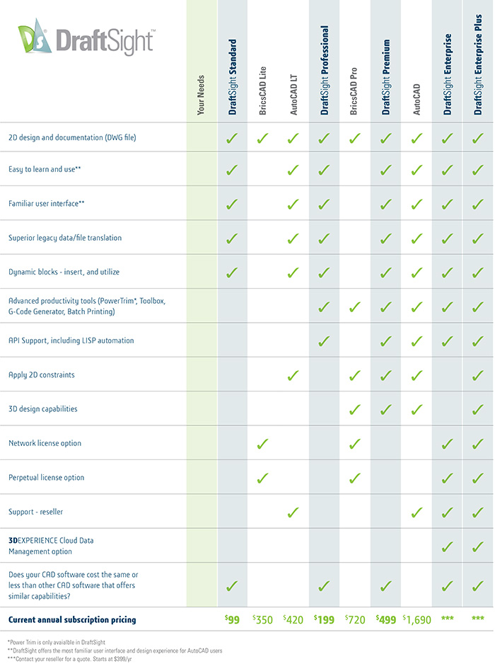 - DraftSight ENTERPRISE/Enterprise Plus – For organizations who need the power of DraftSight Professional – 2D CAD (Enterprise) or Premium 2D/3D CAD (Enterprise Plus) as well as network licensing and deployment for multiple users or sites, and perpetual licensing options. Annual subscriptions start at $399. Get a quote.