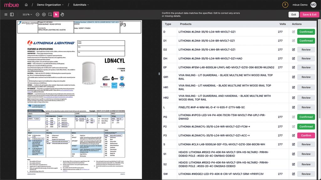 mbue Submittals uses a proprietary AI model and computer vision to analyze drawings and specifications — including electrical schedules — and automatically extracts the required product information. The platform can generate submittals for light fixtures, switchgear, panels, devices, and other materials, streamlining a traditionally time-consuming and error-prone process.